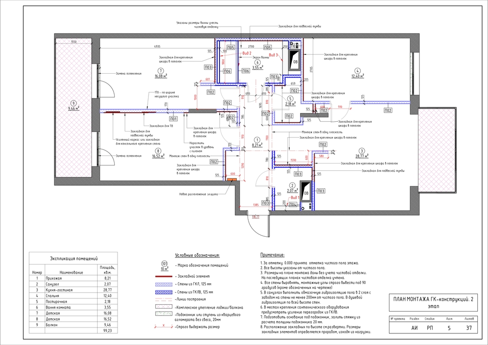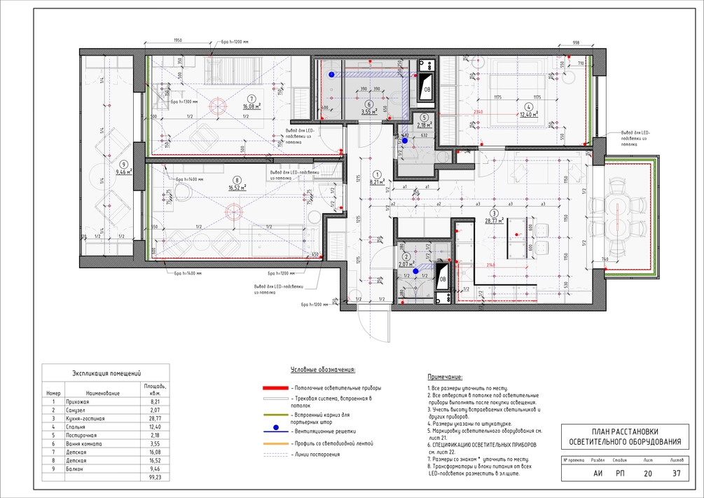 This is a complete drawing project of interior design for an apartment of 99 sqm developed in revit 2024 version. The project (rvt) includes all families presented in the drawings as well as set template sheets for drawings of interior design. Language of the project is in Russian. Families and set drawings could be used to develop your own projects. The following is the set of drawings included in the project (to see the full project drawings in pdf click the link):